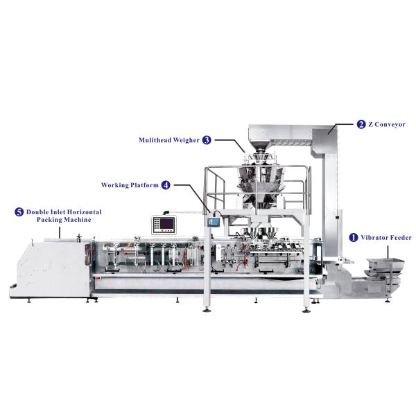 The packaging System is including Vibrator feeder, Z conveyor, Working platform, Multihead weigher, Double inlet horizontal packing machine. Versatile in design, easy to link up with other downstream packaging equipment, such as powder filler, multiheads weigher, metal detector, check weigher, case sealer etc.what's more, the system is safety guard protected for high speed and consistent production. The innovative and practical solution at reasonable costs.